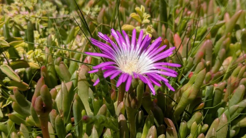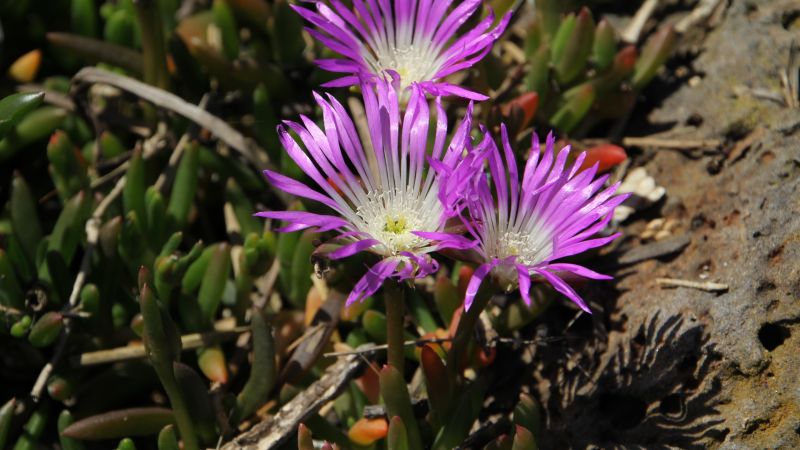 This resilient, succulent groundcover, also known as rounded baby pigface or salty fingers, hugs the earth in a lush mat of green leaves that can blush red or yellow in dry spells. From September to February, its daisy-like neon pink-purple flowers sleep at night and reawaken at midday – a phenomenon known as Nyctinasty, giving the noon-flower its name.
